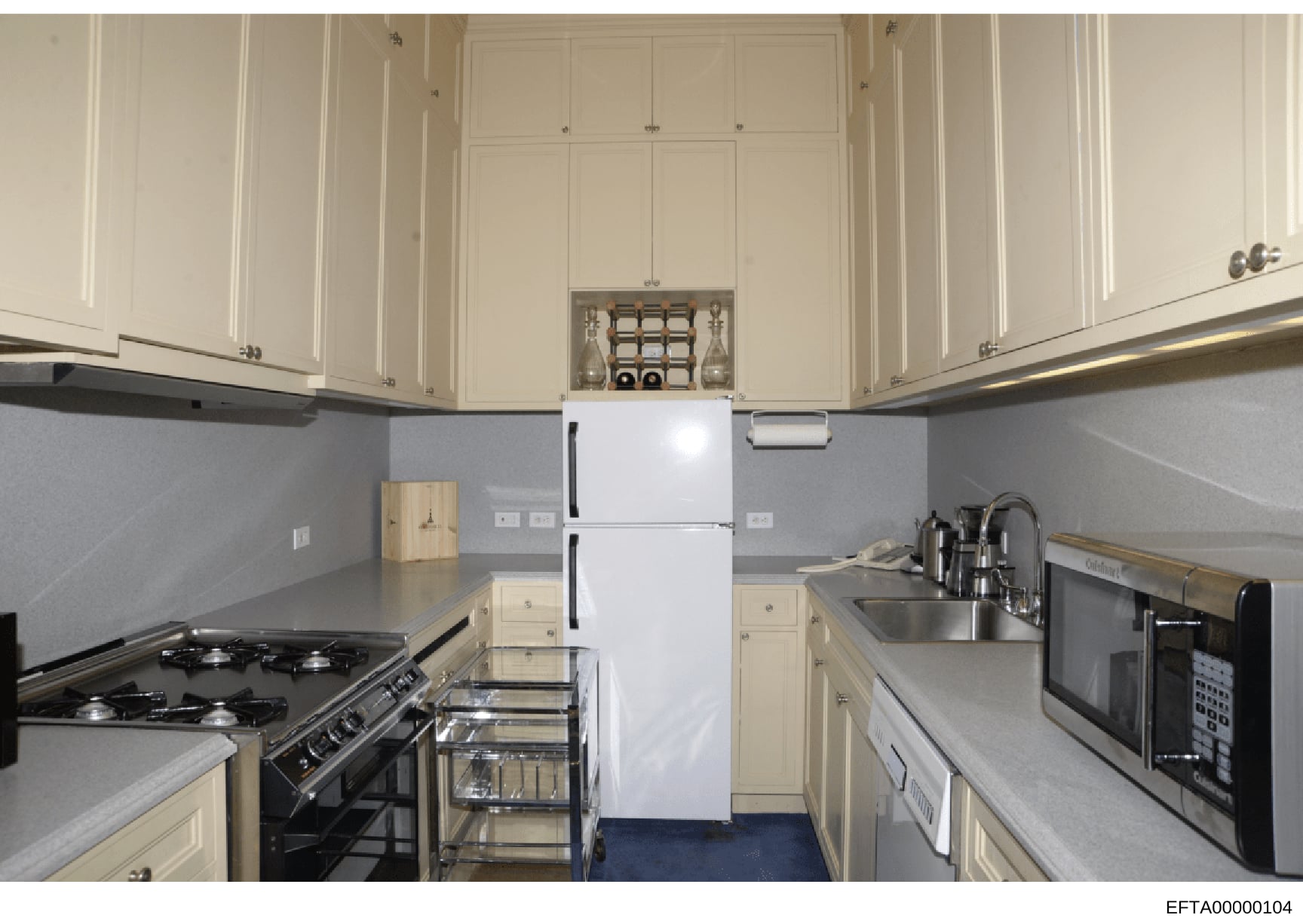 This is a photograph of a residential kitchen, showing appliances, cabinetry, and countertops. The image appears to be documentation of a property interior, likely taken as part of property inventory or investigation evidence. The kitchen features cream-colored cabinetry, stainless steel appliances, gray countertops, and blue flooring.