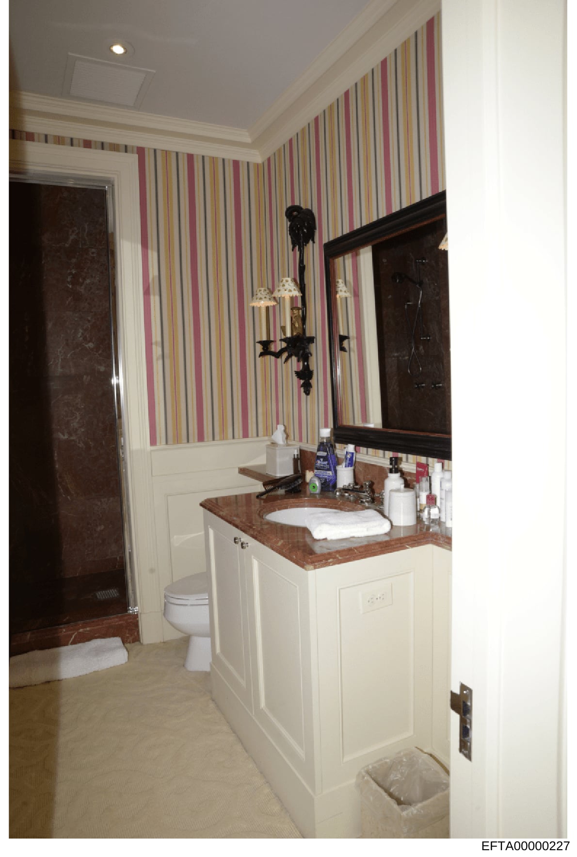 This is a photograph of a residential bathroom, showing interior design and fixtures. The image appears to be evidence documentation from a property investigation, featuring a vanity, sink, toilet, and decorative elements including striped wallpaper and ornate lighting fixtures.