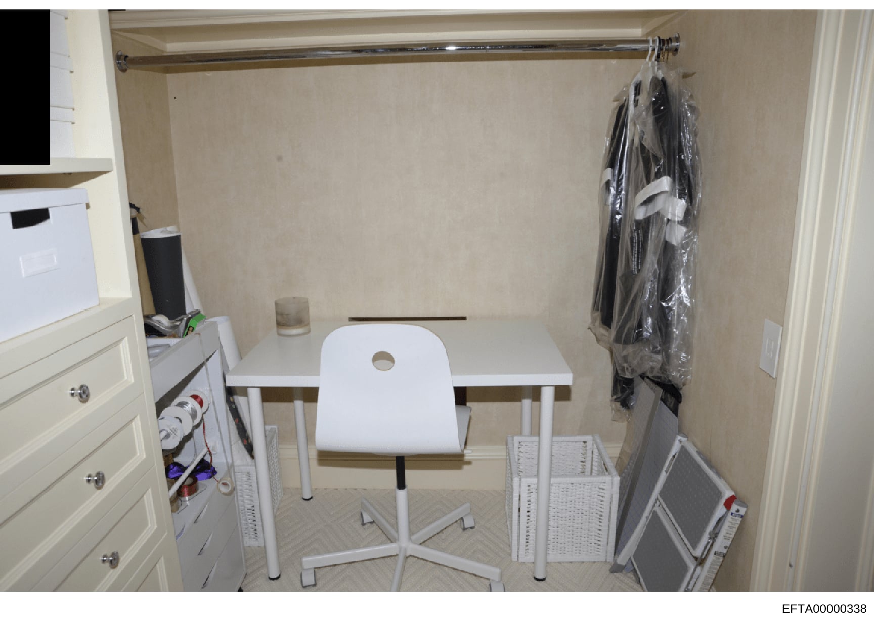 This is a photograph of an interior room, likely a bedroom or office space, showing a simple white desk with a matching white chair, cream-colored walls, a closet area with hanging clothing in plastic, and storage furniture including a dresser with drawers. The room appears modest and sparsely furnished, suggesting it may be servant quarters, guest housing, or staff accommodation.