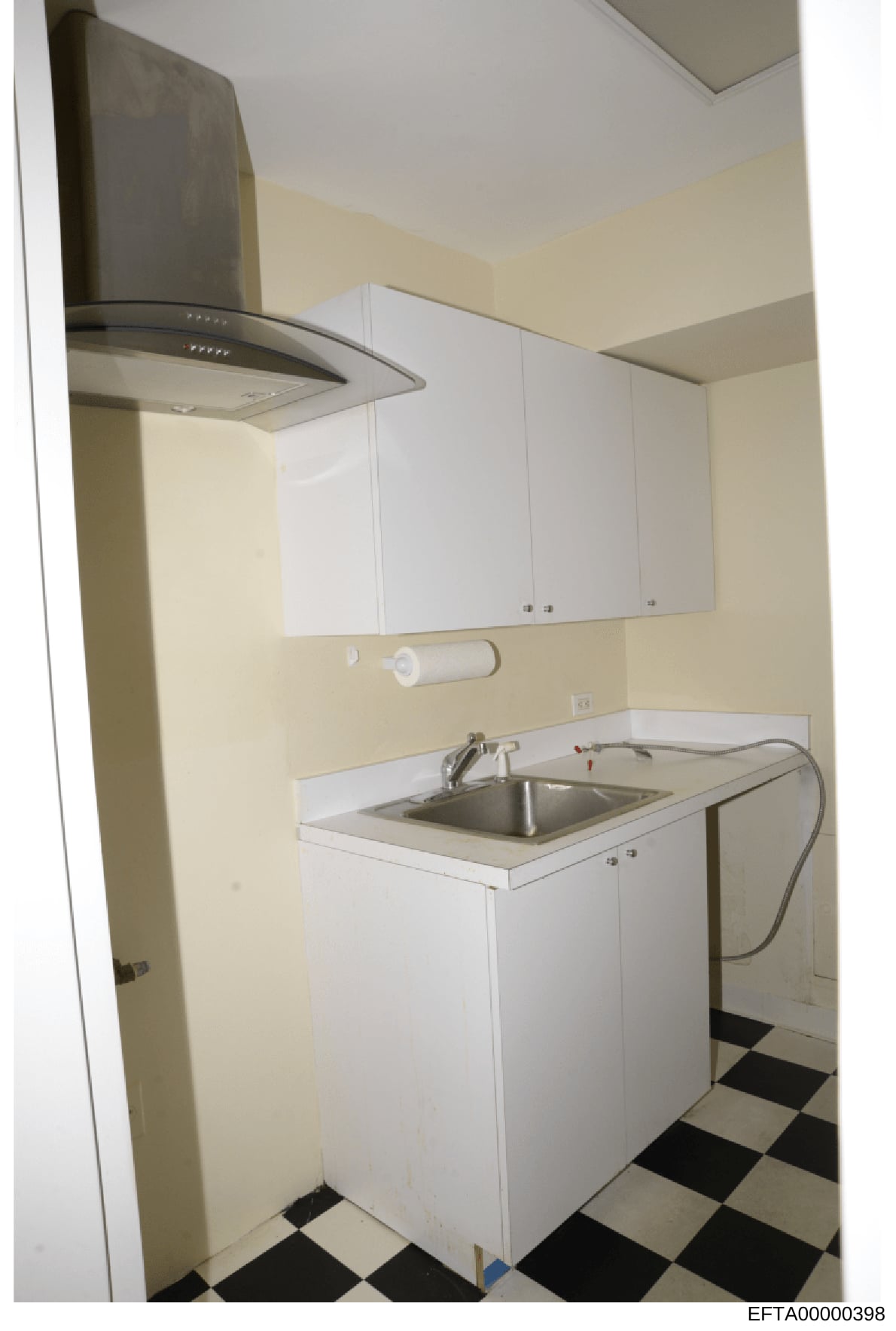 Photograph of a residential kitchen interior, likely from one of the properties under investigation. The image shows a compact kitchenette with white cabinetry, a stainless steel sink, modern range hood, and checkered black-and-white tile flooring. The photo appears to be documentation of property conditions or furnishings.