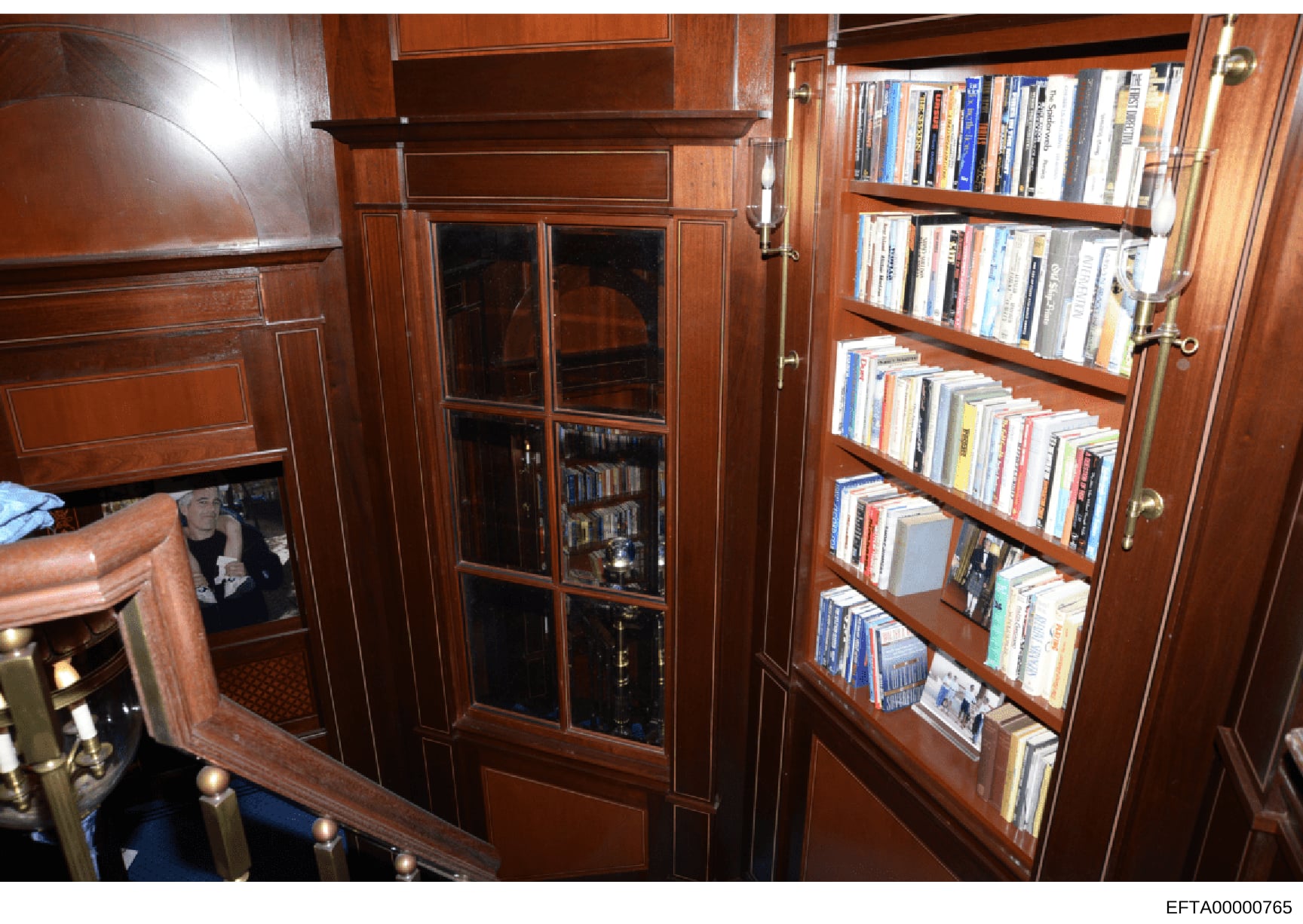 This is a photograph of an interior room with custom wooden cabinetry and glass-fronted shelving containing a collection of books, DVDs, and media. The space appears to be part of a luxury residence, featuring floor-to-ceiling wood paneling and organized media storage. The photograph was taken as evidence documentation during the investigation.