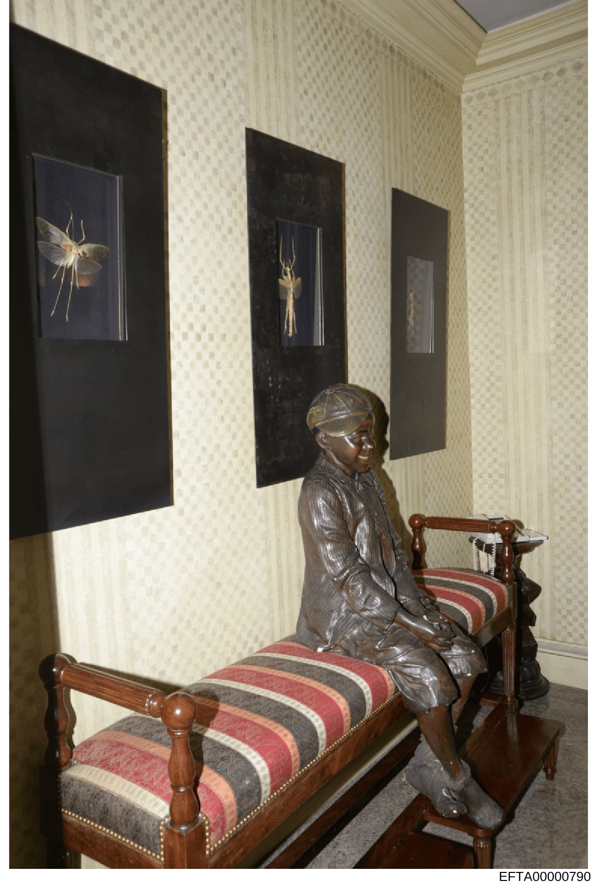The photograph depicts an elegant interior space with cream and white patterned wallpaper. Three black-framed artworks are mounted on the wall, each containing what appears to be gold-colored insects or natural specimens on dark backgrounds. A bronze sculpture of a seated figure wearing formal attire and a cap is positioned on a wooden bench with red, gray, and white striped upholstery and decorative brass nail trim. The bench has wooden armrests and legs. The flooring appears to be dark hardwood. The overall aesthetic suggests a formal residential or collection space with attention to decorative arts and natural history specimens.