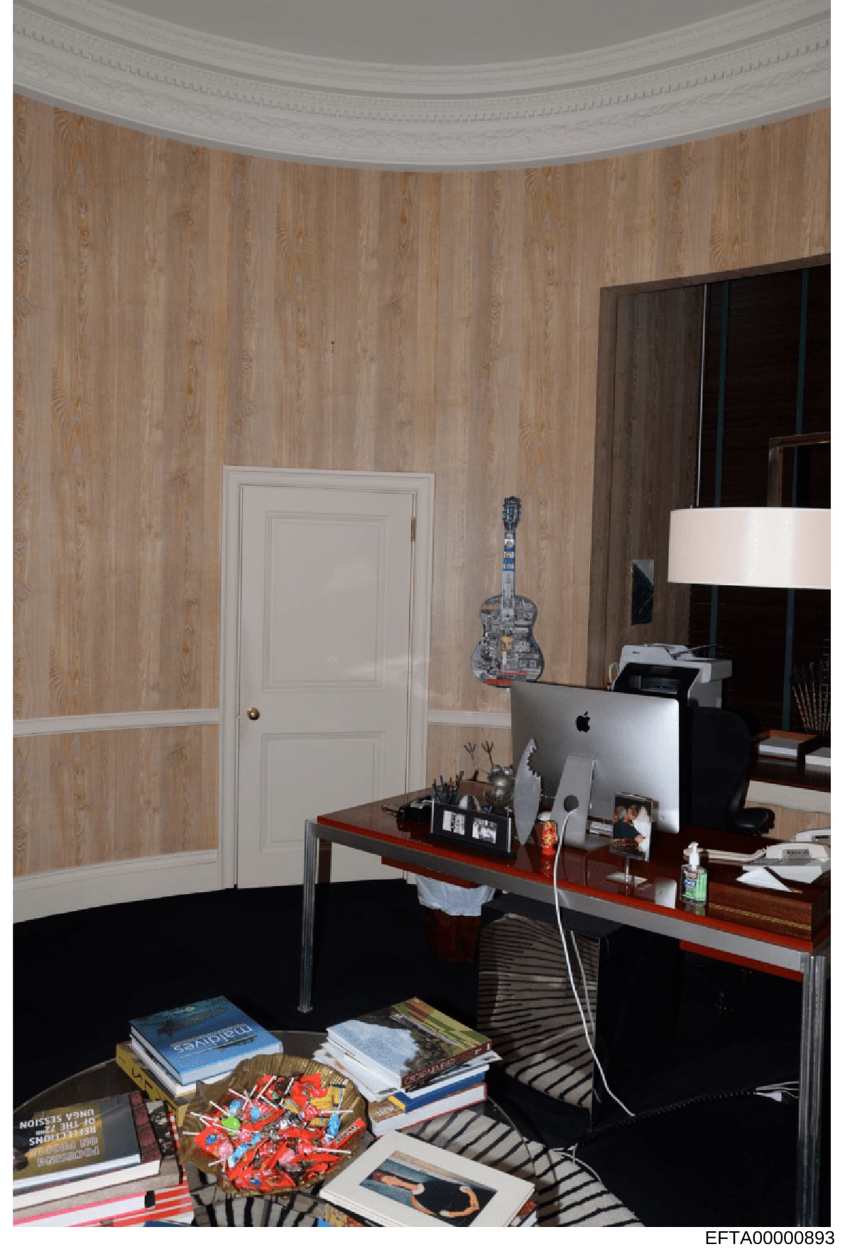 This is a photograph of an interior room, likely a bedroom or office, showing a desk workspace with a computer monitor, various personal items, books, and decorative elements. The room features wood-grain wallpaper, a curved ceiling detail, and a white door. The photograph appears to be evidence documentation from the investigation, captured with Bates stamp EFTA00000893.