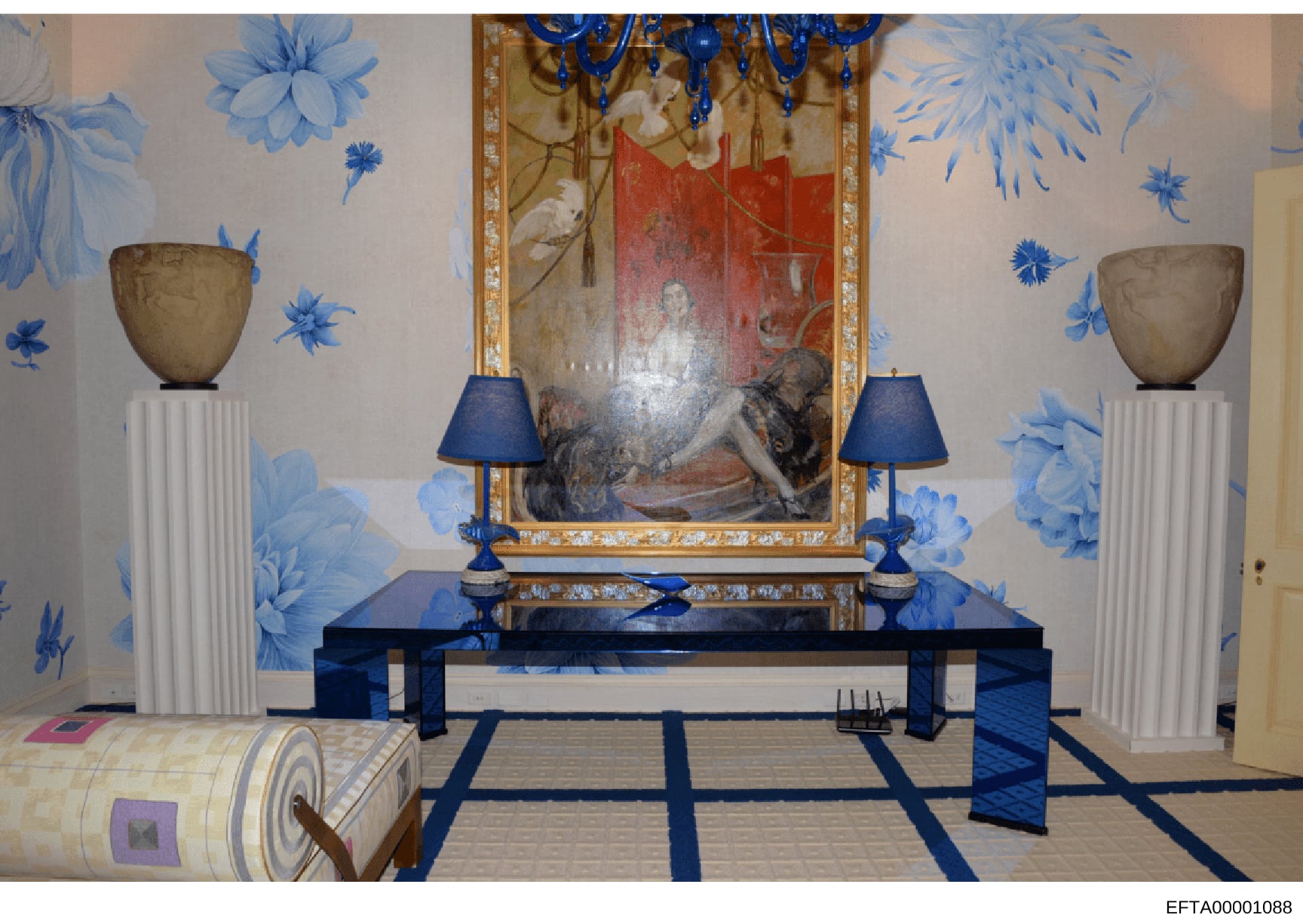 This is a photograph of an elegantly decorated interior room featuring blue and white Chinoiserie-style wall treatments, a central display table with classical framed artwork above it, and coordinating decorative elements. The room appears to be part of a residence documented during the investigation, showing detailed interior design and furnishings.