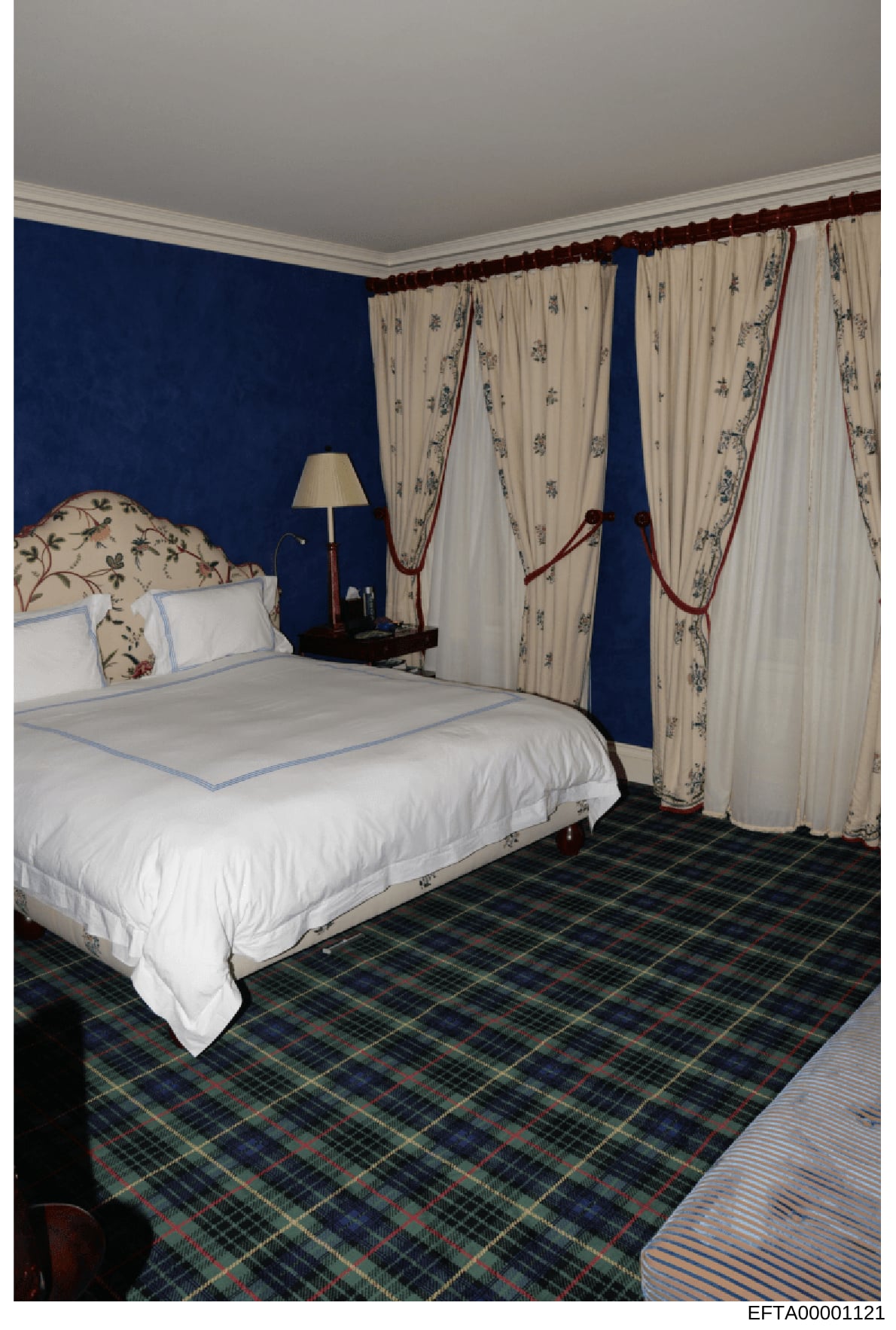 This is a photograph of an elegantly decorated bedroom featuring deep blue walls, a white bedspread with blue trim, a floral-patterned headboard, cream-colored curtains with floral designs and burgundy trim, and a tartan pattern carpet. The photo appears to be documentation of a property's interior, likely from Epstein's residences, as part of the evidence collection in the investigation.