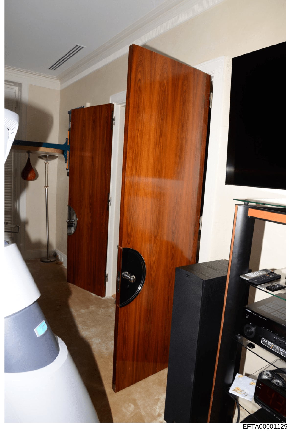 This photograph documents the interior architectural details of one of Jeffrey Epstein's properties, showing ornate wooden columns with decorative ...