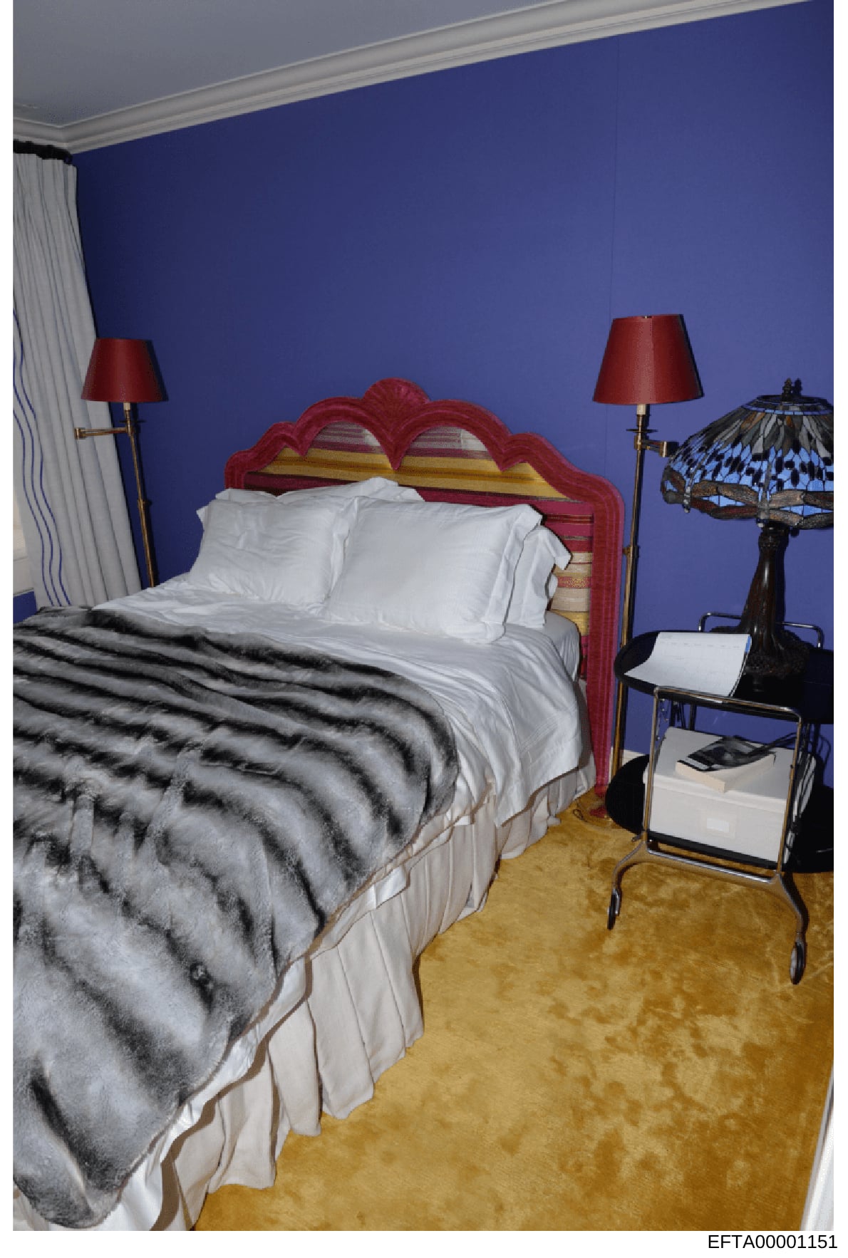 This is a photograph of an upscale bedroom interior featuring a distinctive red ornamental headboard, white bedding with a striped fur throw blanket, and coordinated furnishings. The room has bold blue walls with white crown molding and includes decorative lamps, a Tiffany-style table lamp, and wooden flooring. This appears to be documentation of property interiors, likely from Epstein's residences, as part of the investigation's evidence collection.