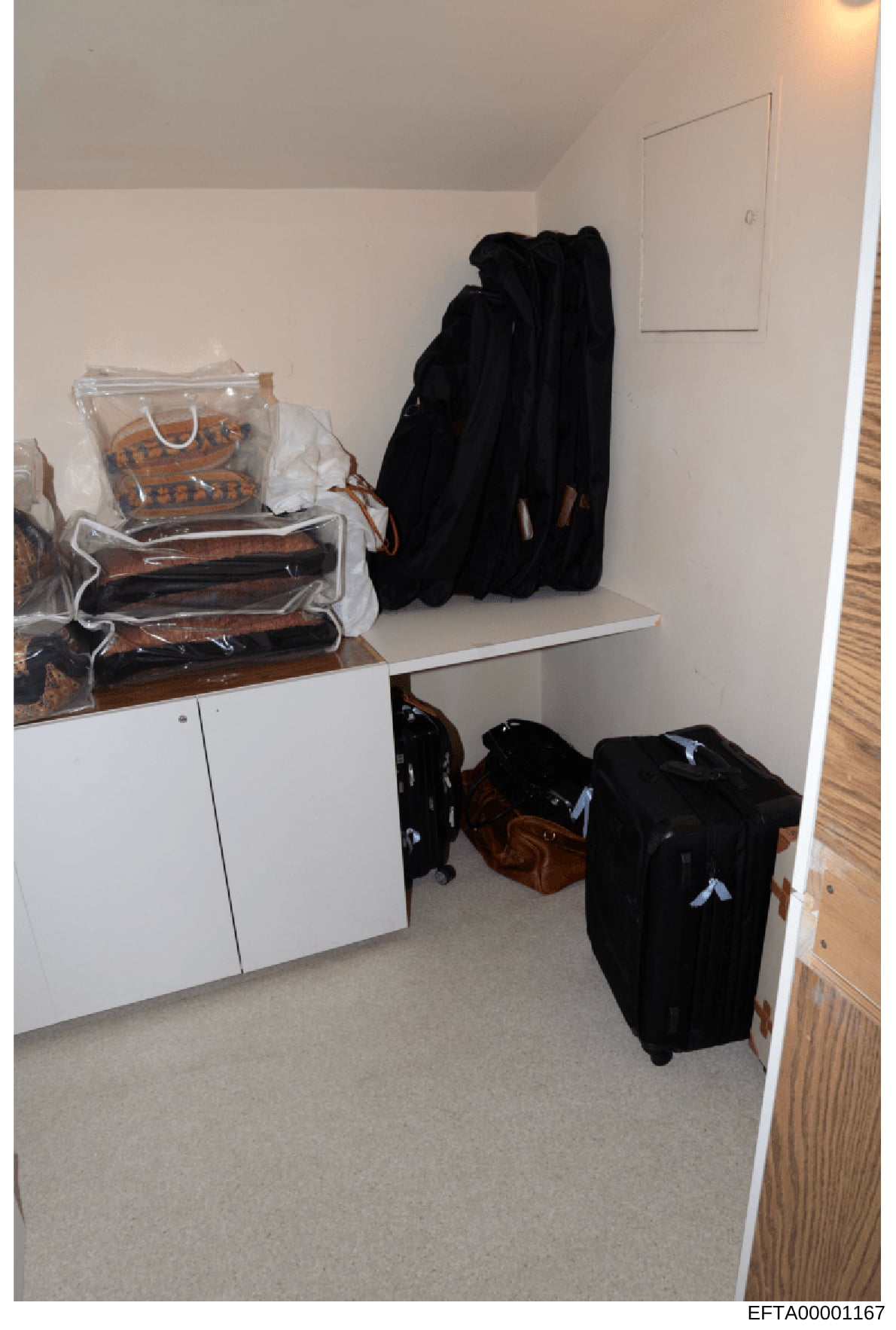This is an evidence photograph of a residential closet space containing stored clothing, luggage, and personal items. The image shows a white shelving unit with folded garments in clear storage bags, black clothing hanging on the wall, and multiple black suitcases/luggage pieces on the floor. The photograph appears to be part of property documentation from an Epstein-related investigation location.