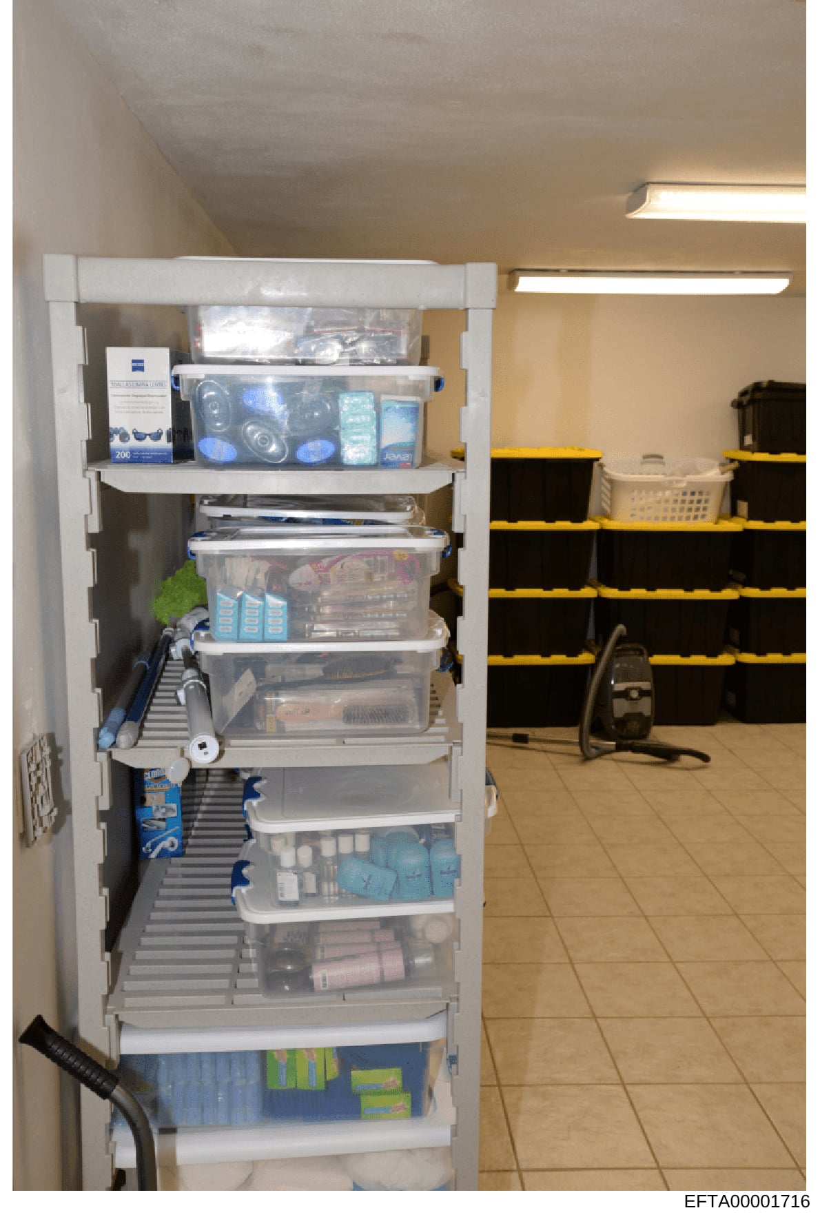 The shelving unit is positioned against a white wall in what appears to be a utility room or storage area. The room has fluorescent ceiling lights and tan/beige tile flooring. To the right side of the image, there are black storage shelves with yellow safety tape and a white laundry basket visible. An upright vacuum cleaner can be seen on the right side of the frame.