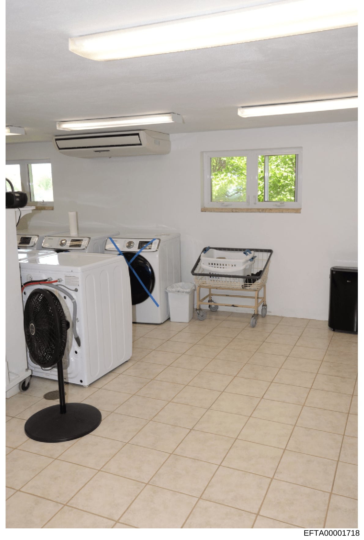 This is a photograph of a modern, well-equipped laundry facility featuring multiple washing machines, dryers, and auxiliary equipment. The room appears to be part of a larger residential or institutional property and is relevant to the investigation as documentation of facilities within properties associated with the subject.