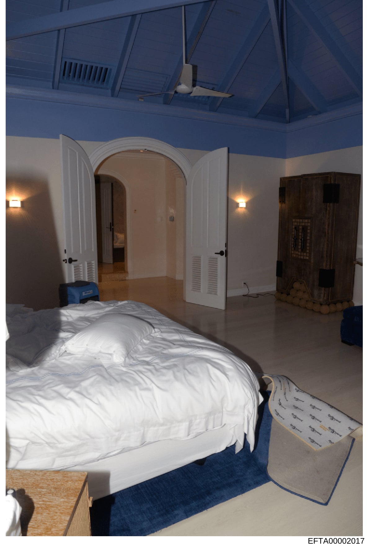 This is an evidence photograph depicting an interior bedroom space with distinctive blue ceiling and white walls. The room contains a bed with white bedding, an arched doorway, wall sconces, and a ceiling fan. The photograph appears to be part of the property documentation for the Epstein investigation, showing interior spaces of a residence.