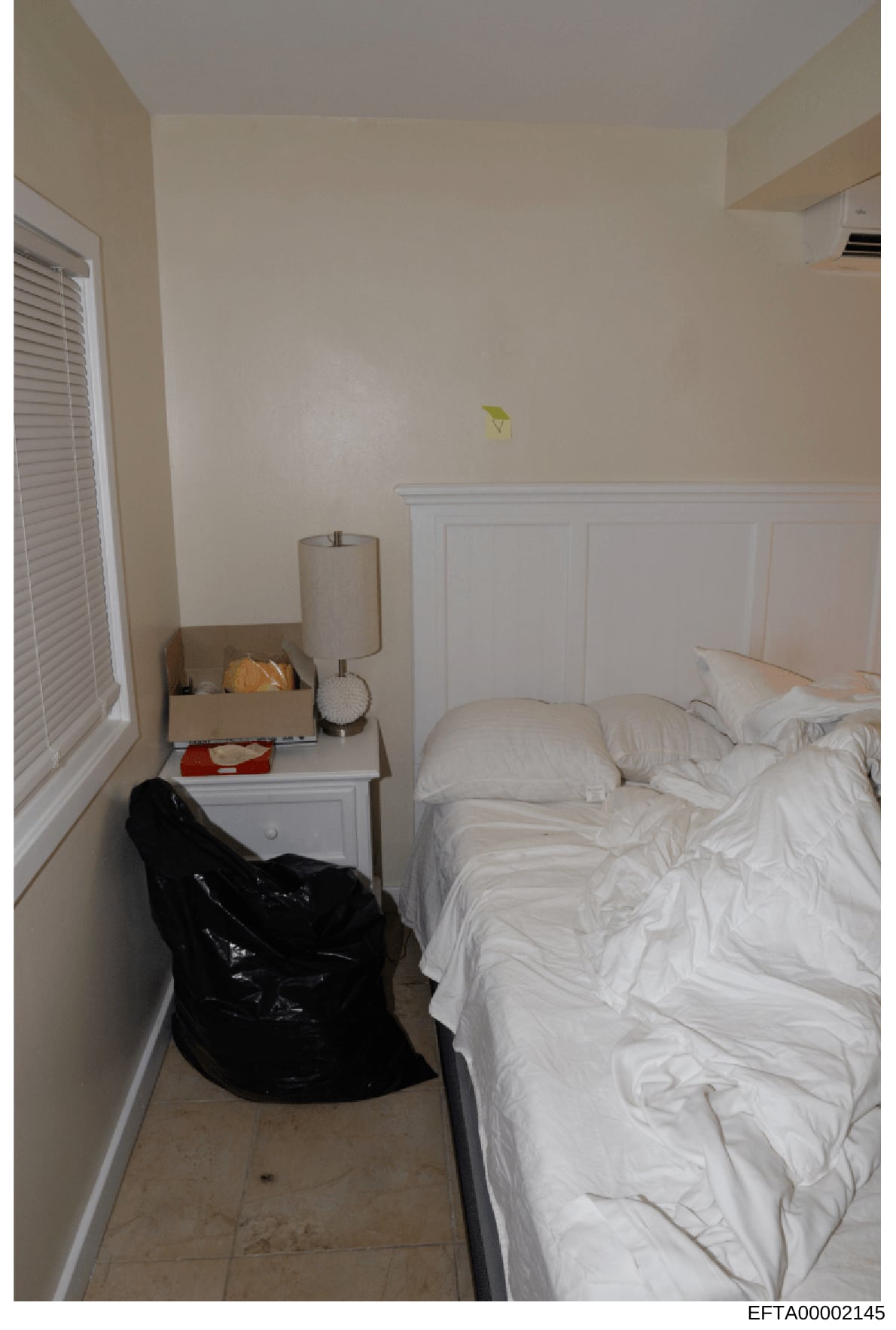 This is a photograph of a bedroom interior showing a bed with white linens, a bedside table with a lamp and various items, a black bean bag chair, venetian blinds on a window, and cream-colored walls with white wainscoting. The photo appears to be evidence documentation from the investigation, showing a residential bedroom space.