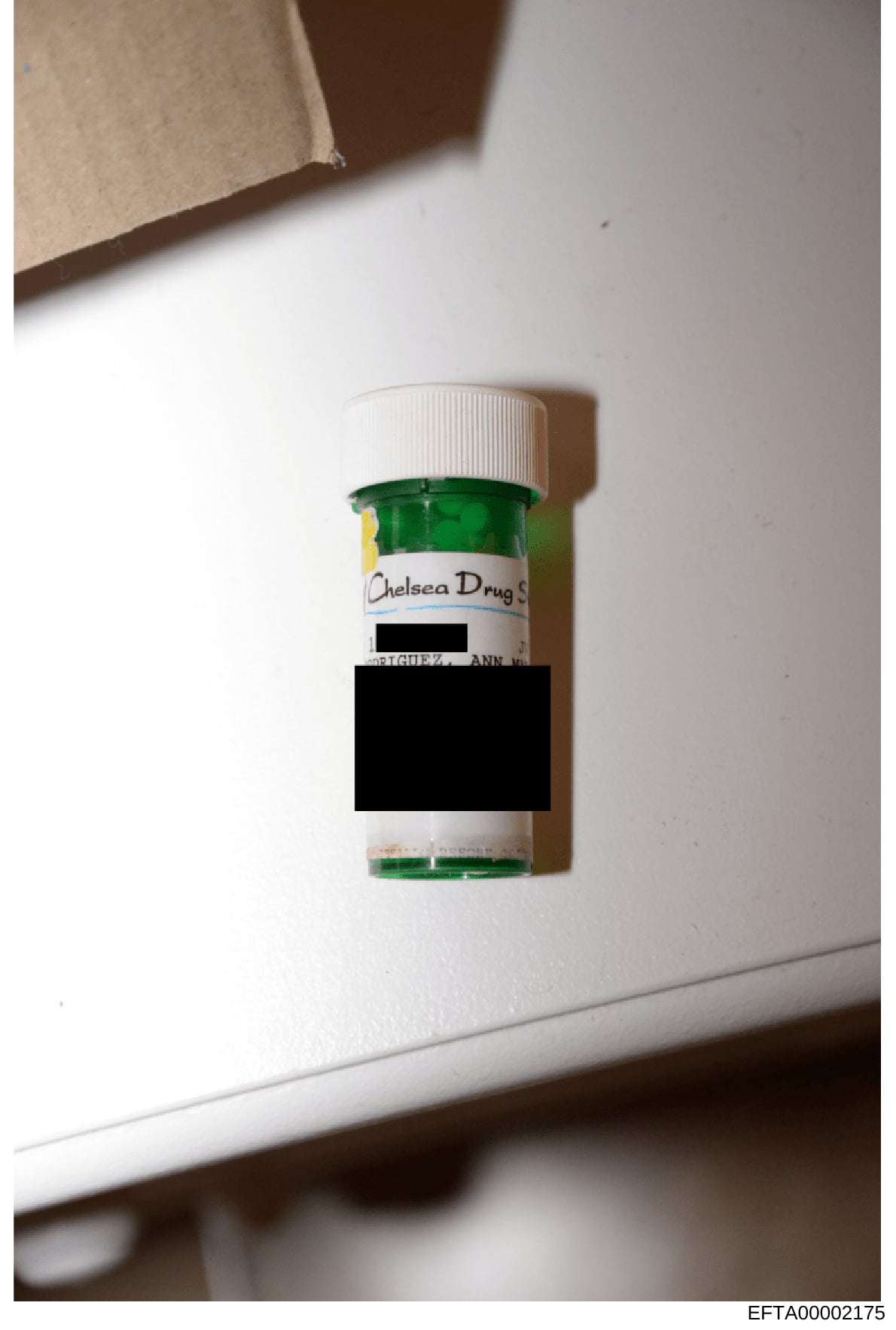 This is an evidence photograph showing a green prescription medication bottle with a white cap and a label reading 'Chelsea Drug Store.' A significant portion of the label is redacted with a black bar, obscuring the patient name, prescription details, and medication information. The bottle appears to be photographed as physical evidence in the investigation.