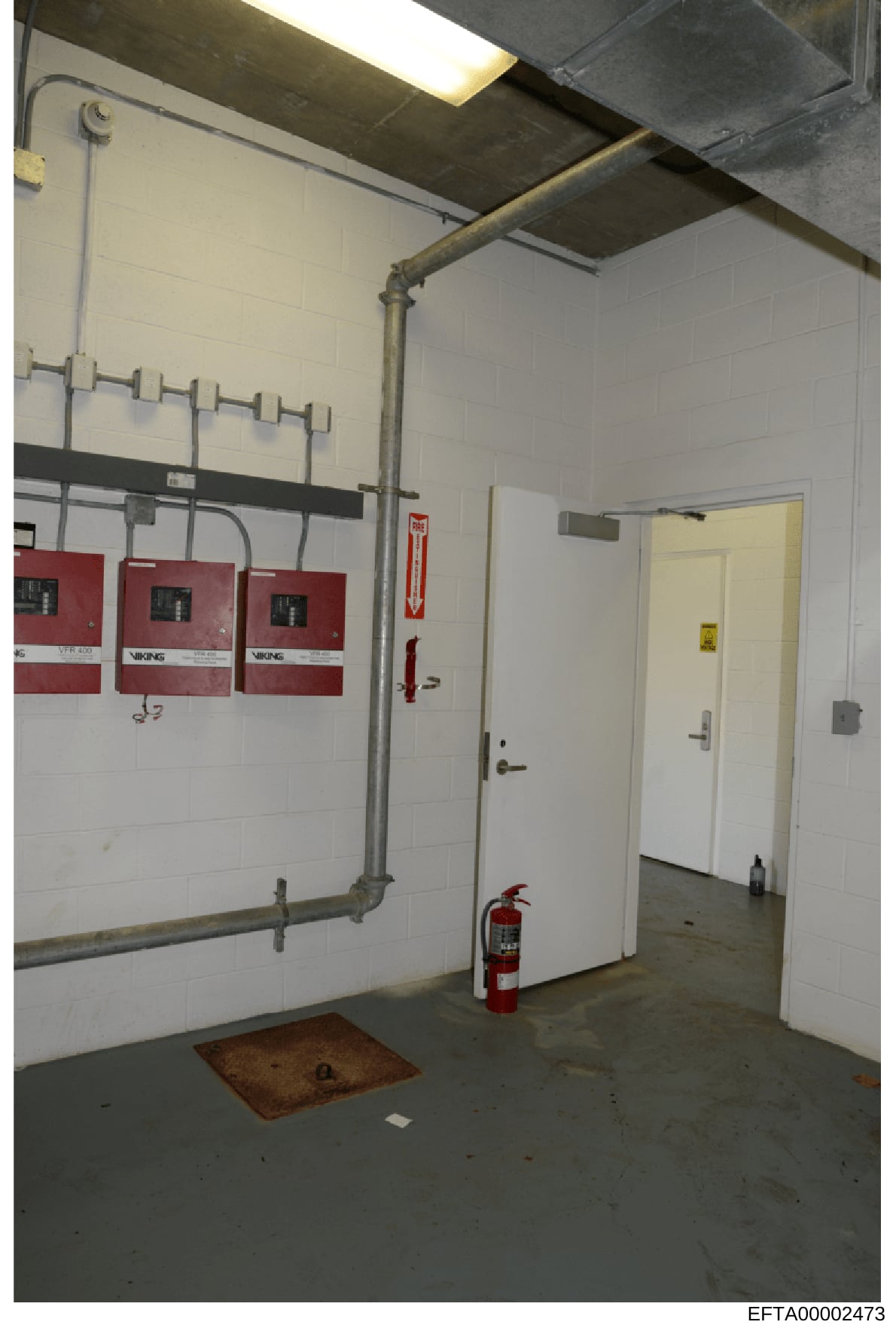 The photograph depicts a basement or utility room with industrial characteristics. The left wall is lined with white tile or panels and contains three red Viking brand fire alarm/suppression system panels mounted horizontally. Below these panels is exposed metal piping and ductwork. A red fire extinguisher is positioned near a white door in the center-right of the image. The floor is concrete with a metal grate or drain cover visible in the center-left. A yellow door is visible on the right side of the room. The ceiling shows exposed structural elements and ducting. The room appears to be part of a building's mechanical or security infrastructure.
