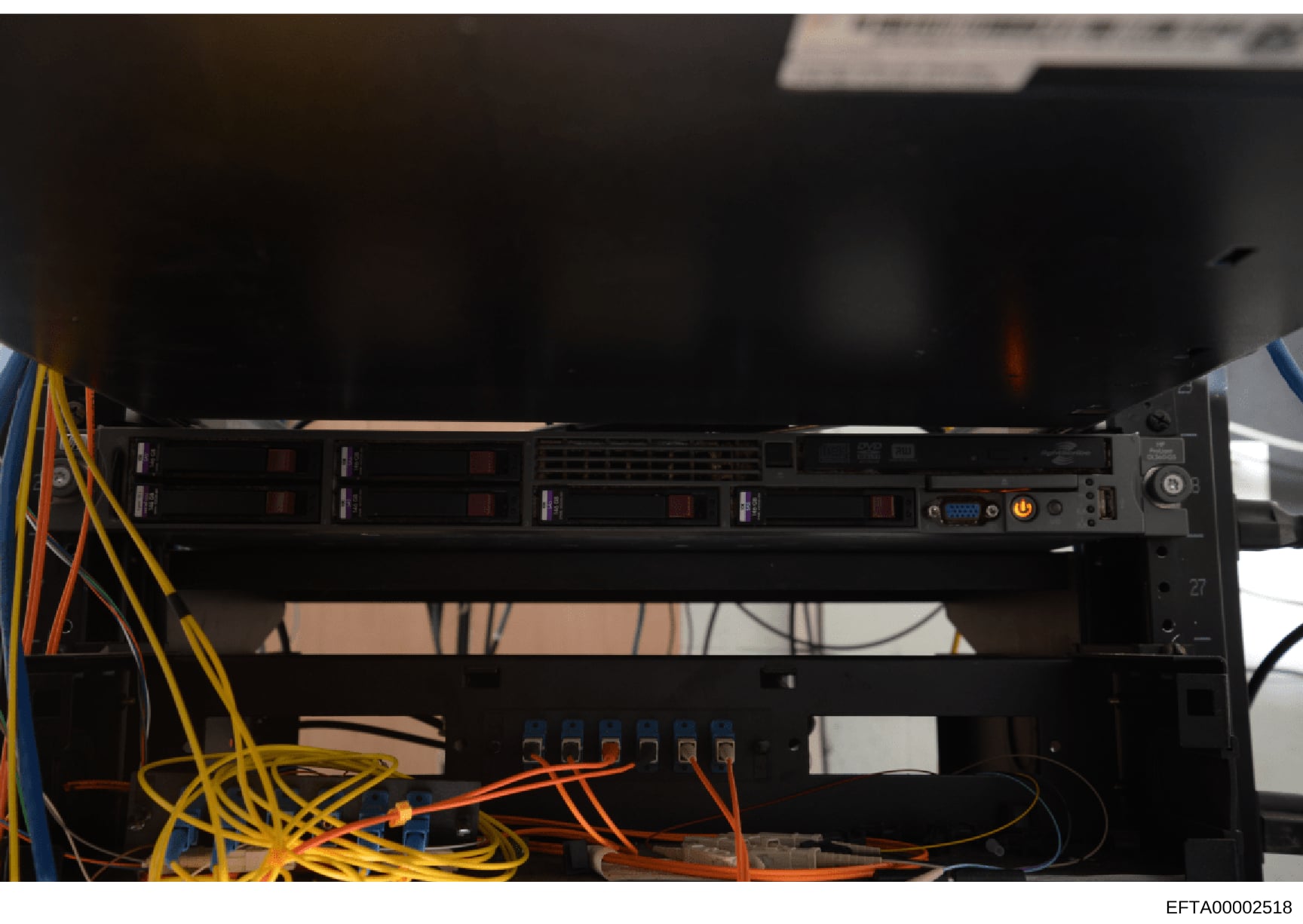 This photograph shows a server rack or network equipment installation containing multiple rack-mounted devices with status indicator lights, network connections, and extensive cable management with yellow and orange network/power cables. The image appears to be documentation of IT infrastructure, possibly from a property associated with the investigation.