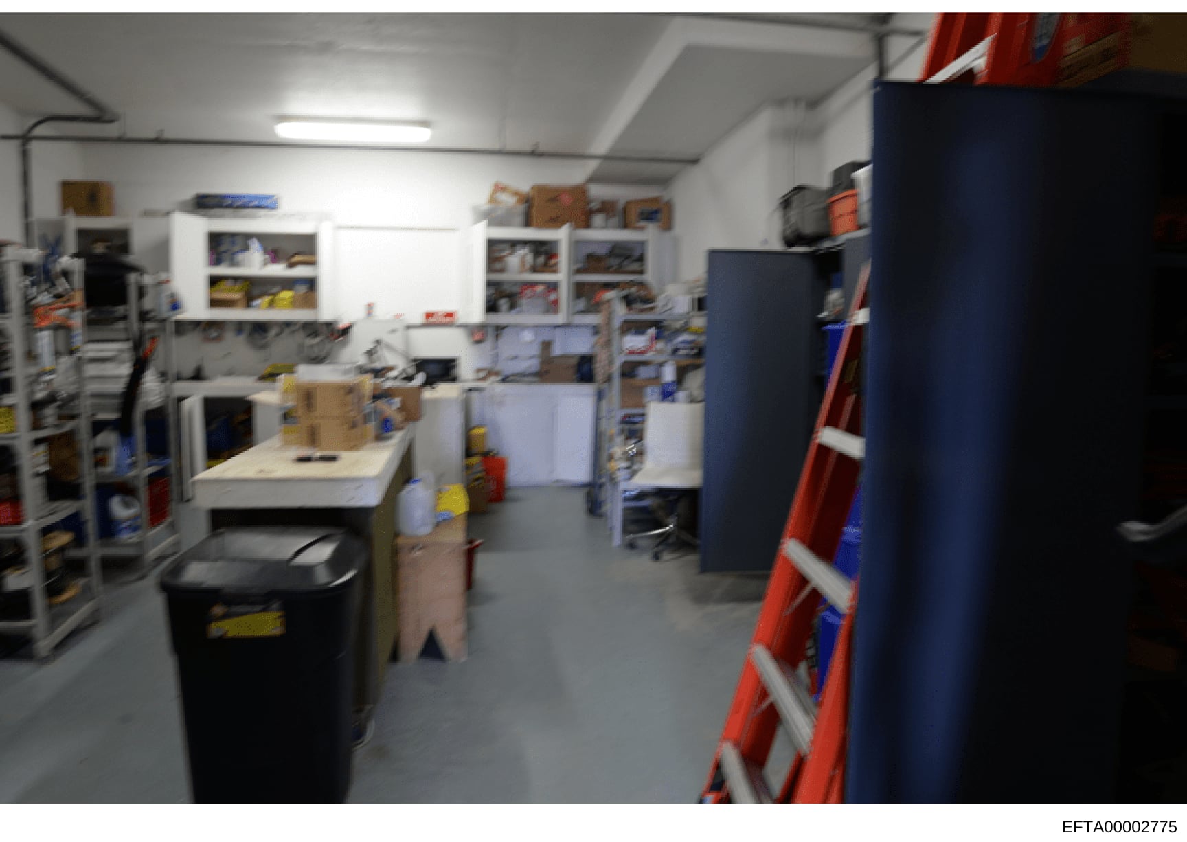 This photograph shows the interior of a storage room, workshop, or utility space containing various tools, equipment, and supplies organized on shelves and work surfaces. The image appears to be evidence documentation from the investigation, though the specific location and relevance to the case are not immediately clear from the photo alone. The space contains ladder storage, toolboxes, shelving units, and miscellaneous items in an organized facility.