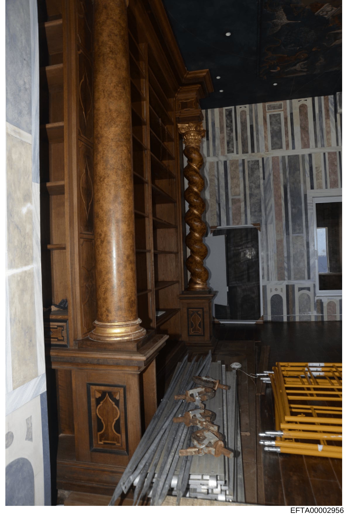 What is "Interior Photo of Epstein Property: Ornate Wooden Columns and Decorative Details"?