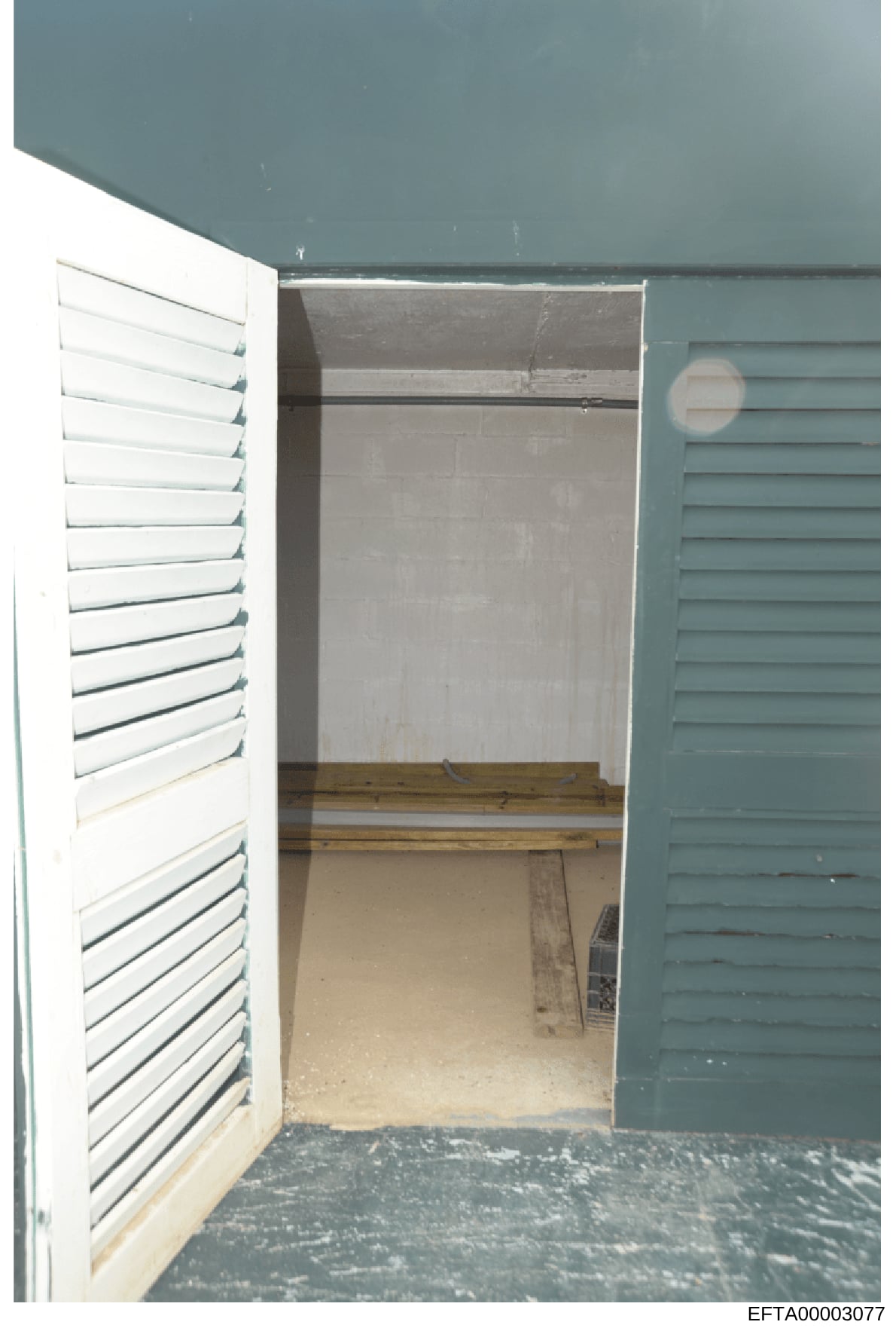 Photograph showing an open doorway into a small interior space. The space features: teal/blue-green painted walls on the ceiling and upper portions; white louvered doors on the left side; matching teal louvered doors on the right side; wooden shelving or support beams visible inside the space; sand or light-colored flooring; a small circular vent or opening visible on the right wall. The room appears empty and unfinished. Natural lighting enters from the front, casting shadows into the interior space. The Bates number EFTA00003077 is visible in the bottom right corner.