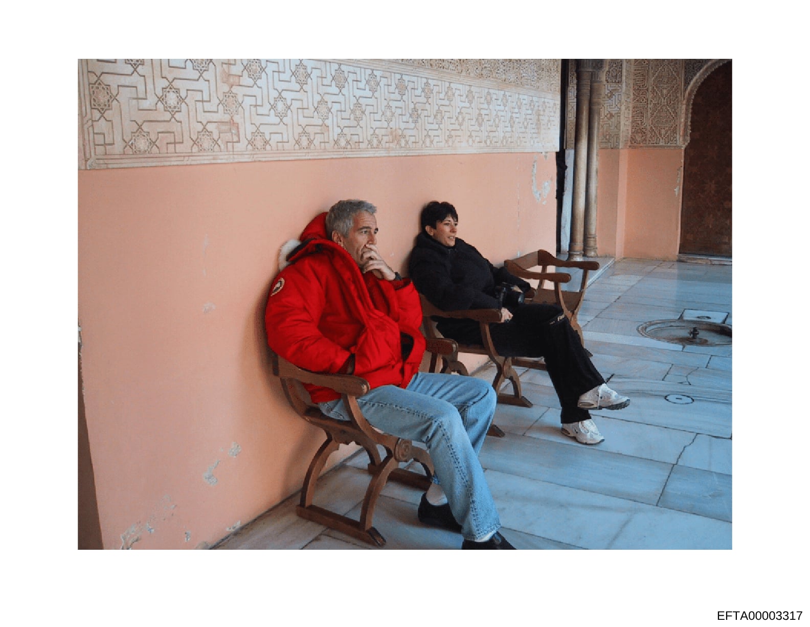 This photograph shows two people sitting on wooden chairs against a peach-colored wall in what appears to be an interior space with Islamic geometric tile work visible at the top. The man on the left wears a red jacket and light blue jeans, while the woman on the right wears dark clothing. The setting suggests a residential or institutional interior, possibly in North Africa or the Middle East based on the architectural style.