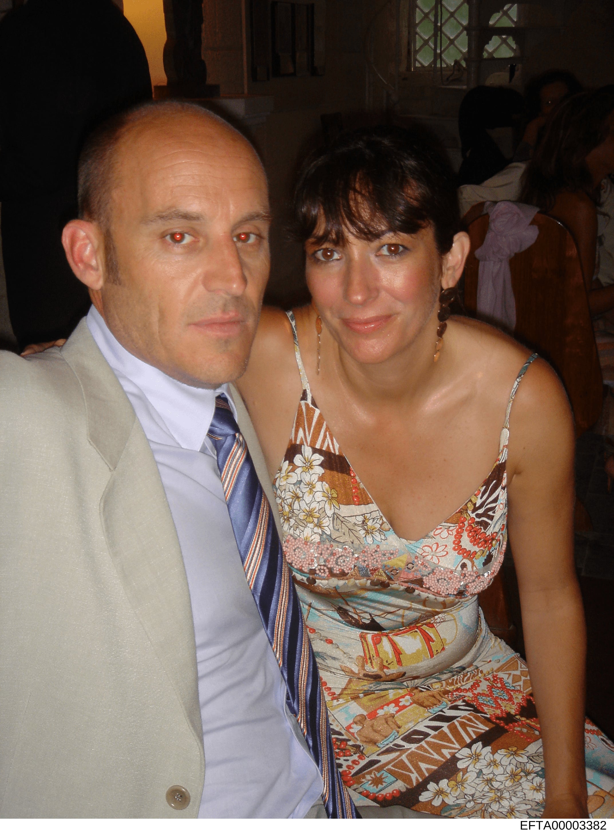 This is a photograph showing two people posing together at what appears to be an indoor social event or gathering. The man is wearing a beige blazer with a light blue shirt and striped tie, while the woman is wearing a colorful patterned sundress. Other people can be seen in the background. The photo is included in the Epstein investigation files but lacks identifying context within the image itself.
