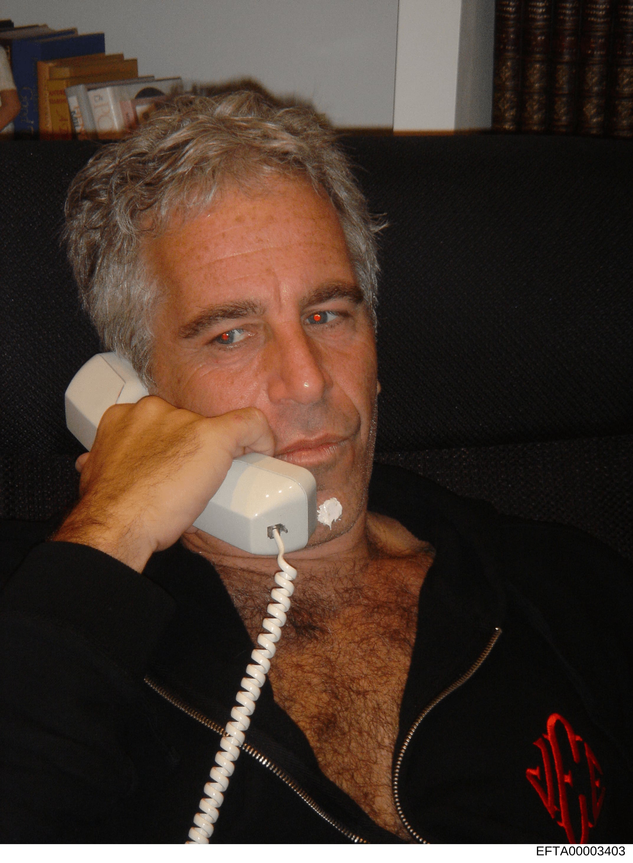 This is a photograph of an adult male with gray hair speaking on a landline telephone. The image appears to be a casual indoor setting with bookshelves visible in the background. The photograph is dated and catalogued as evidence in the Epstein investigation files.